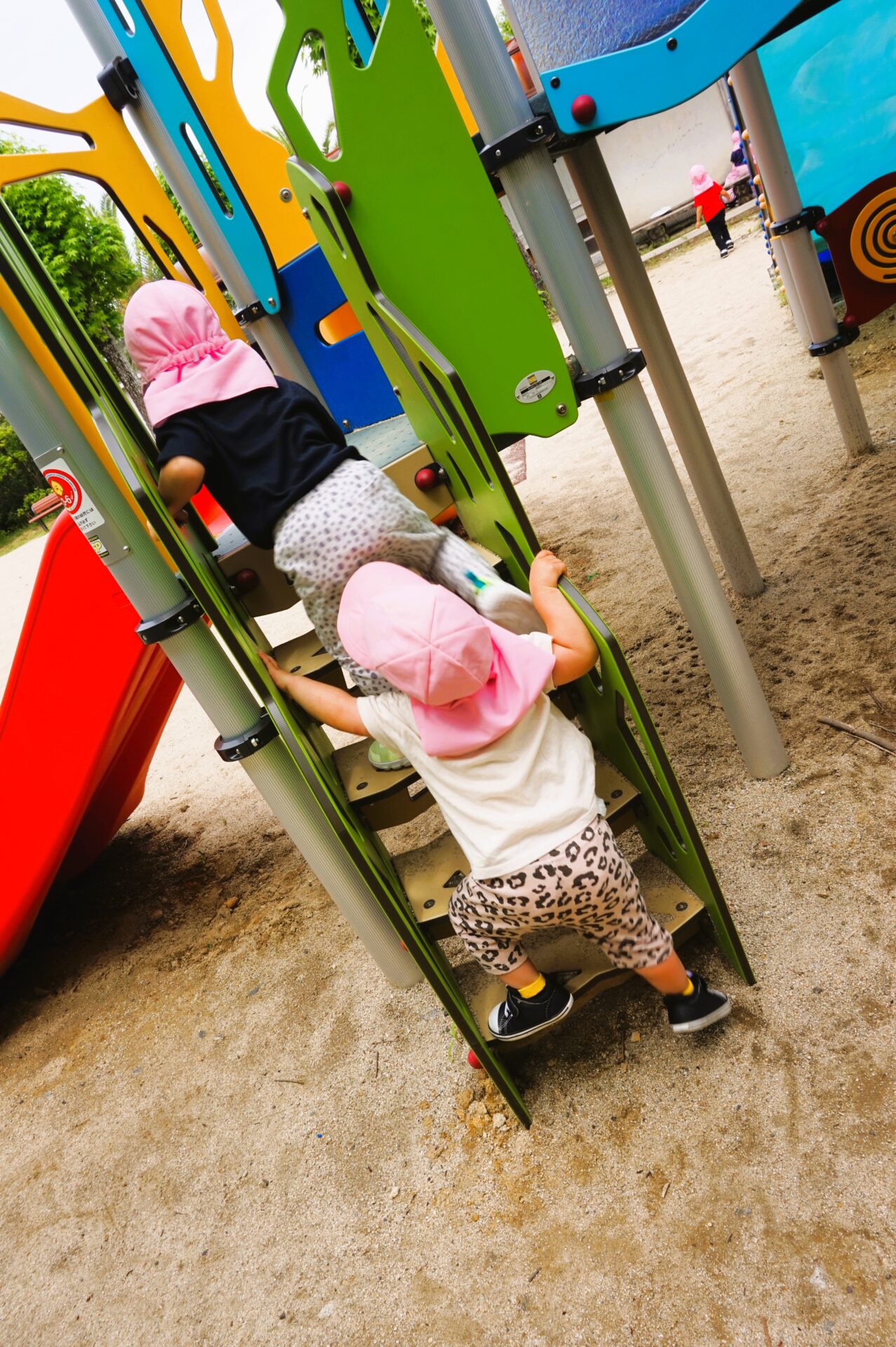 すべり台が大好きなお友達。2人仲良く階段を上っています。ズボンの柄まで仲良しだね♪