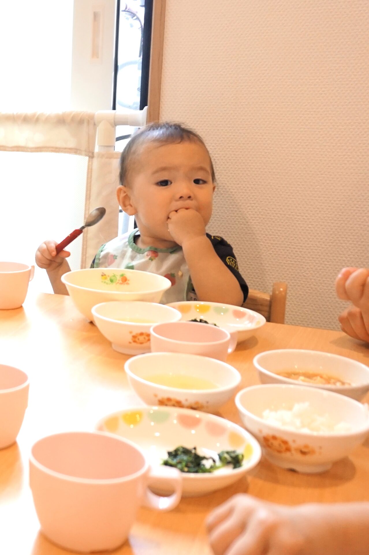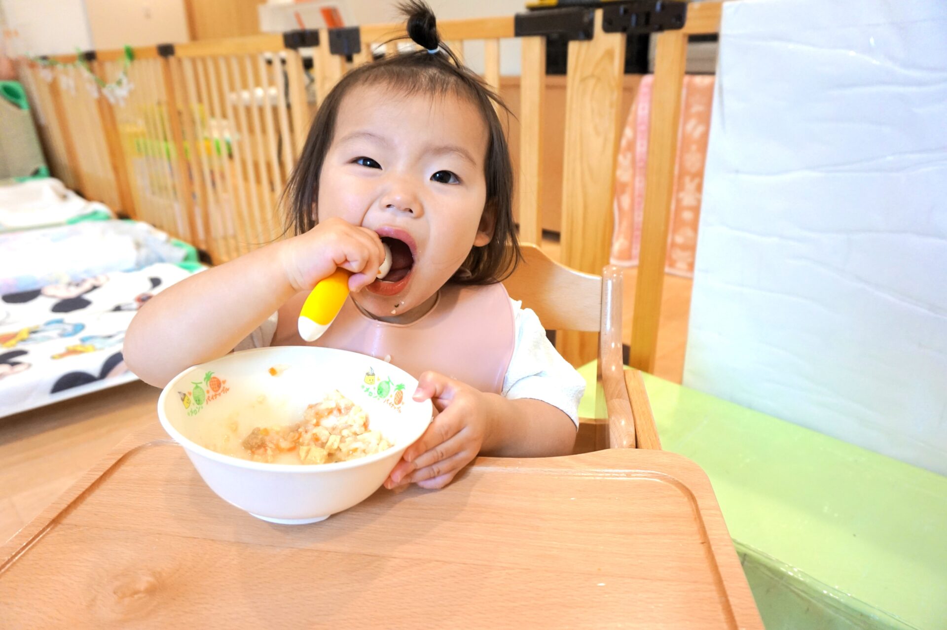 だいち組(1歳児)さんは、4月頃は先生に食べさせてもらっていた子ども達も多く見られましたが、最近はみんな、スプーンを上手に使えるようになってきました😊