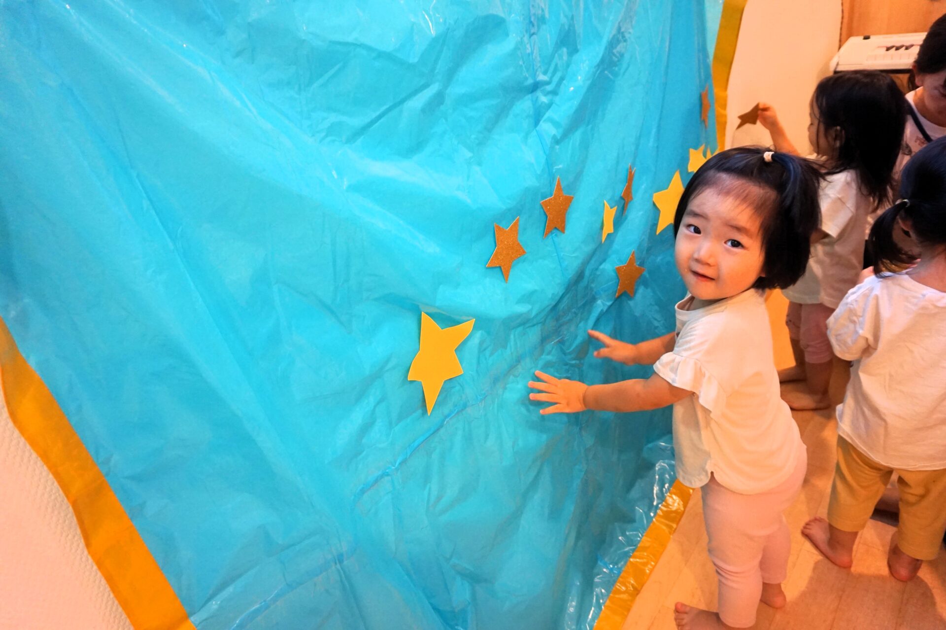 お星さまをペタペタッ✨貼るのが楽しくて何度も先生の所に「ちょーだいっ!」と、お星さまをもらいにいく子もいました。