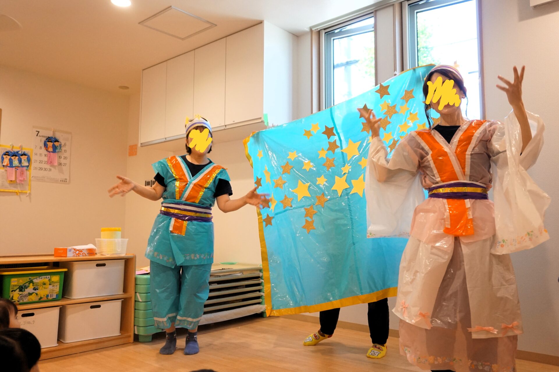 その後、七夕のお話を聞き…織姫様と彦星様が7月7日に会えるように、みんなで天の川を作りました(*^-^*)