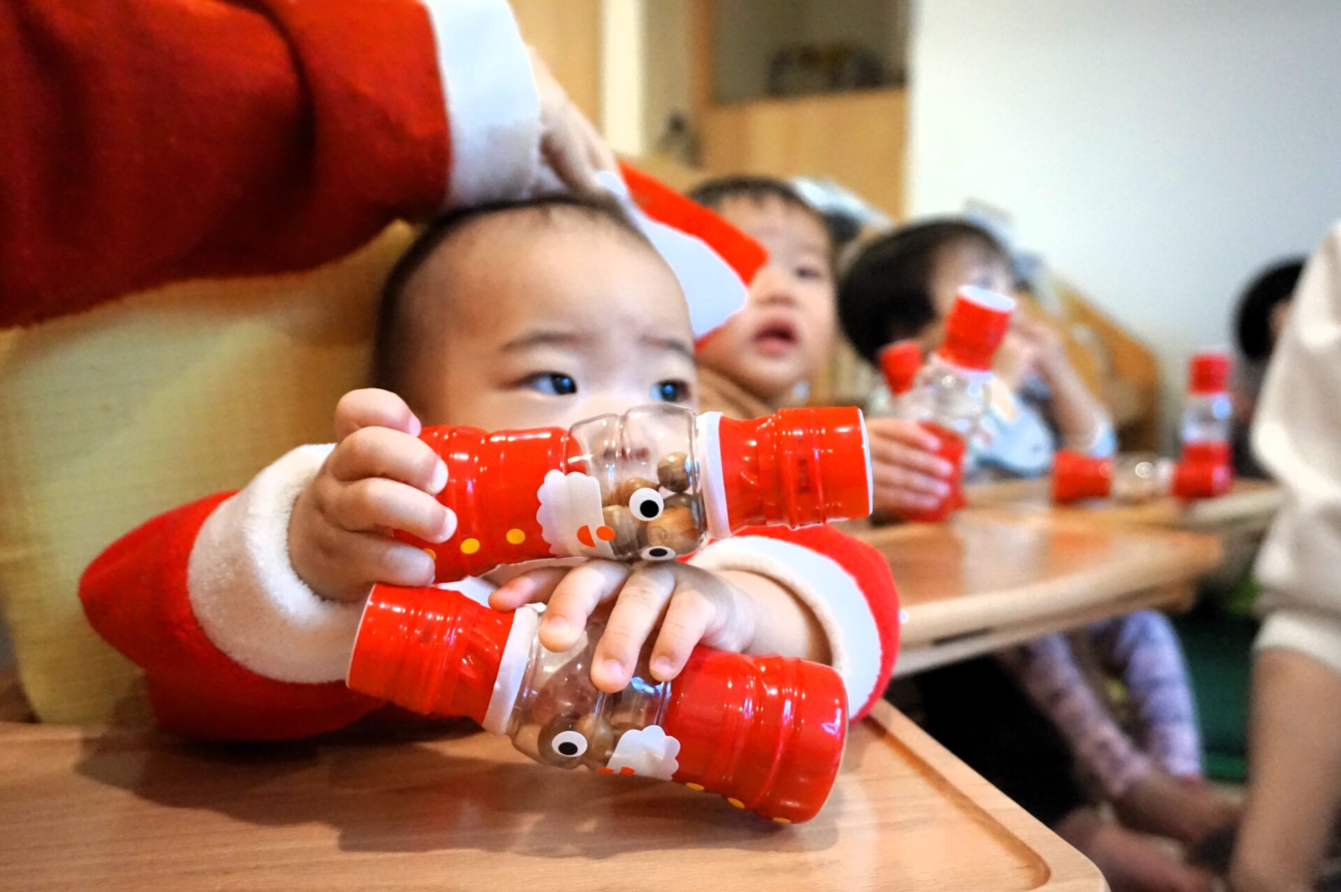 この日の為に作ったマラカスを持って、サンタさんと一緒に『あわてんぼうのサンタクロース』を歌いました♪