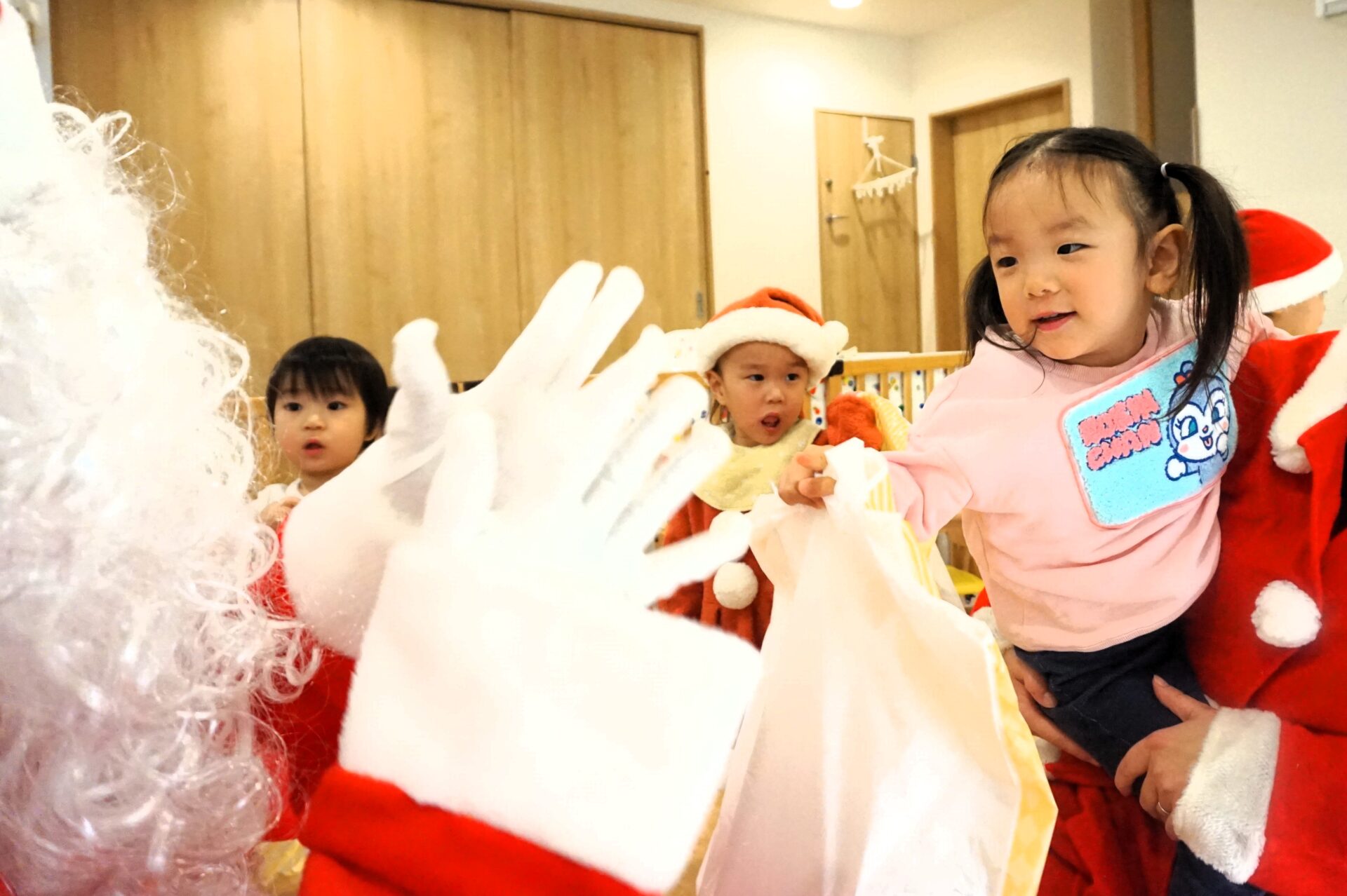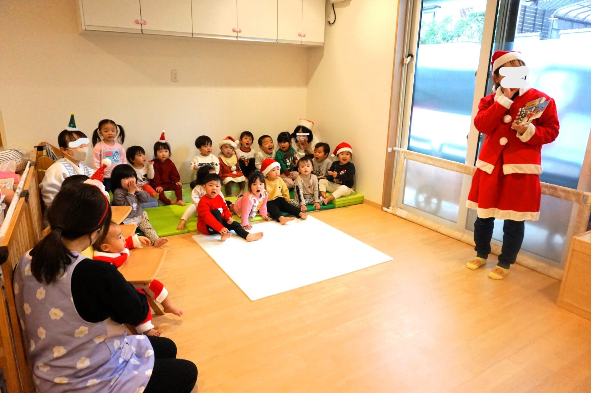 「今日は、くじら保育園にサンタさんが来てくれているんだって♪じゃあ、呼んでみようか!」