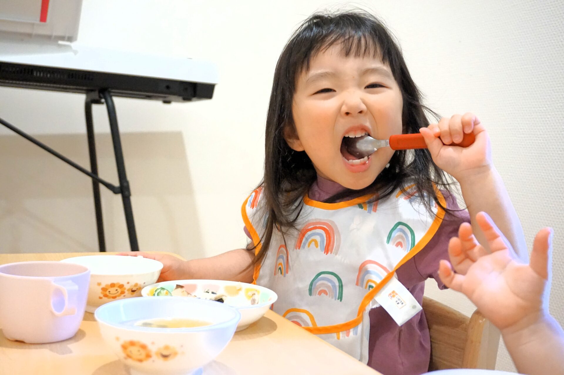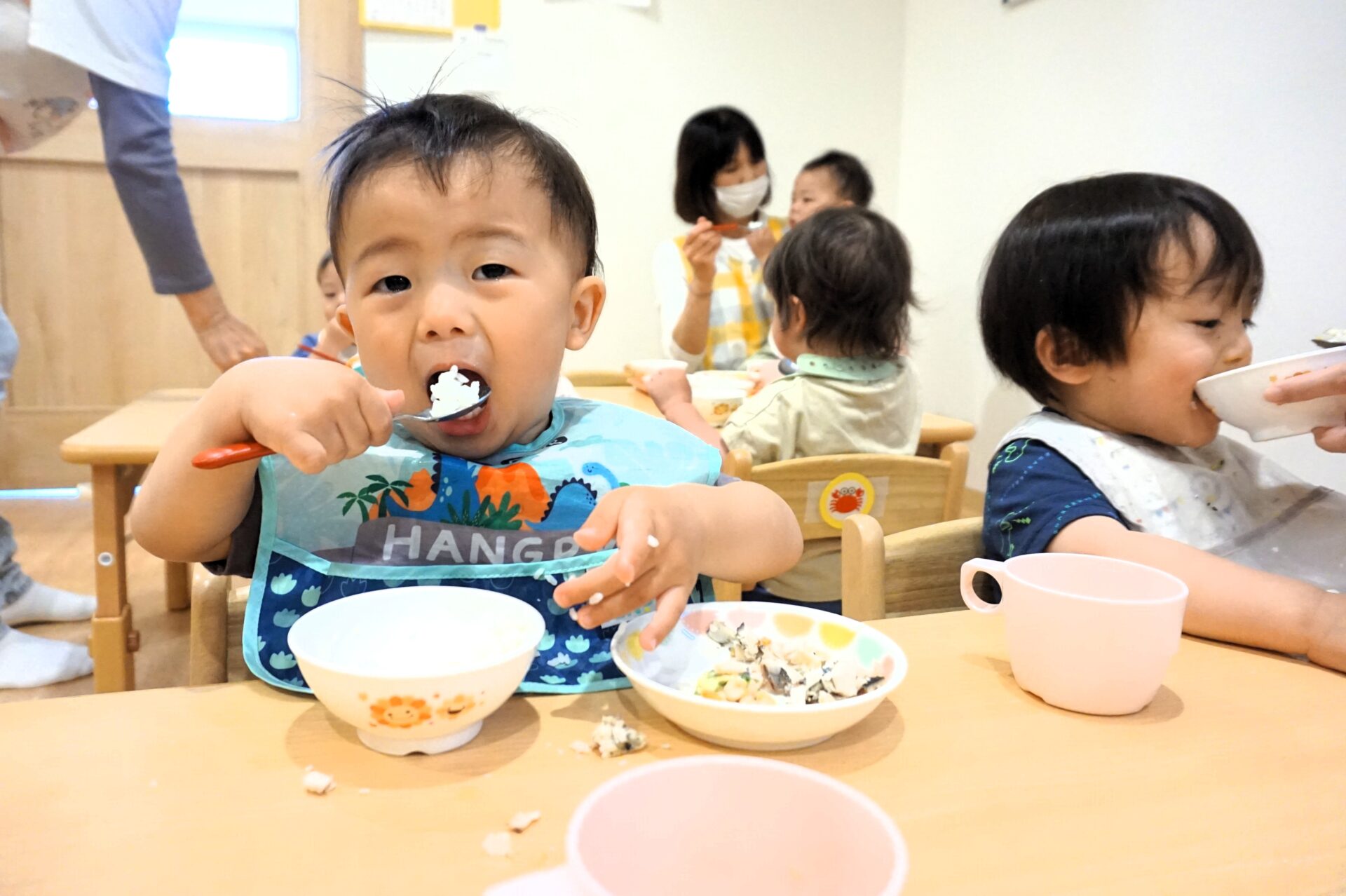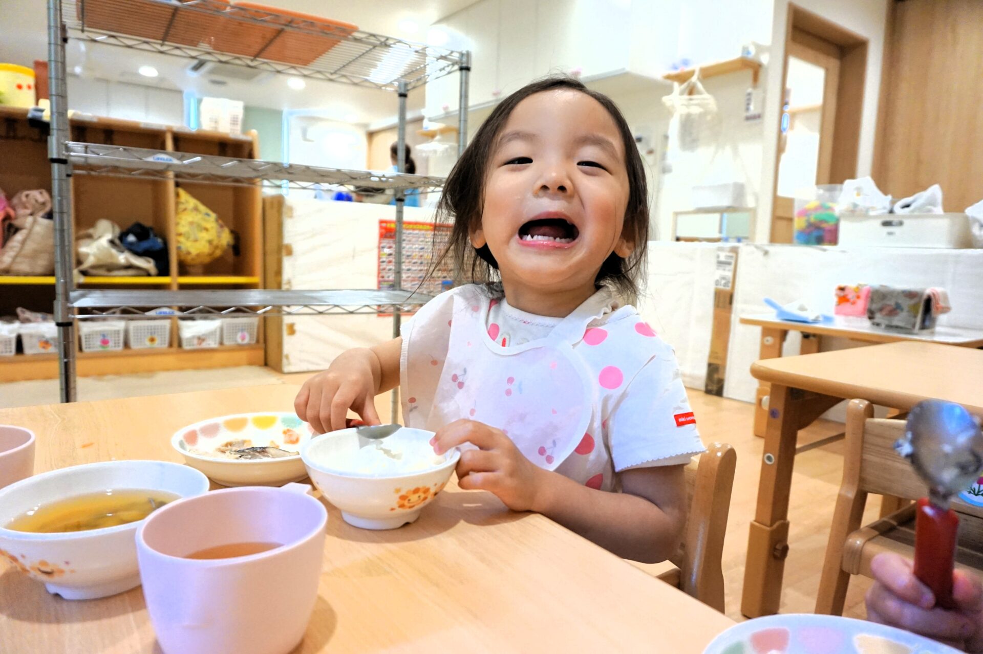 食事中、笑顔あふれる園児達。本当においしいんだろうなぁ…と、私たち保育士もその笑顔に癒されながら見守っていました😊