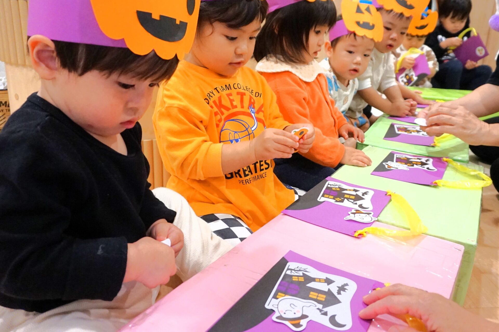 お菓子を入れるためのカバンを作ることになり、それぞれ好きな場所にお化けのシールを貼って、オリジナルのカバンが完成しました✨