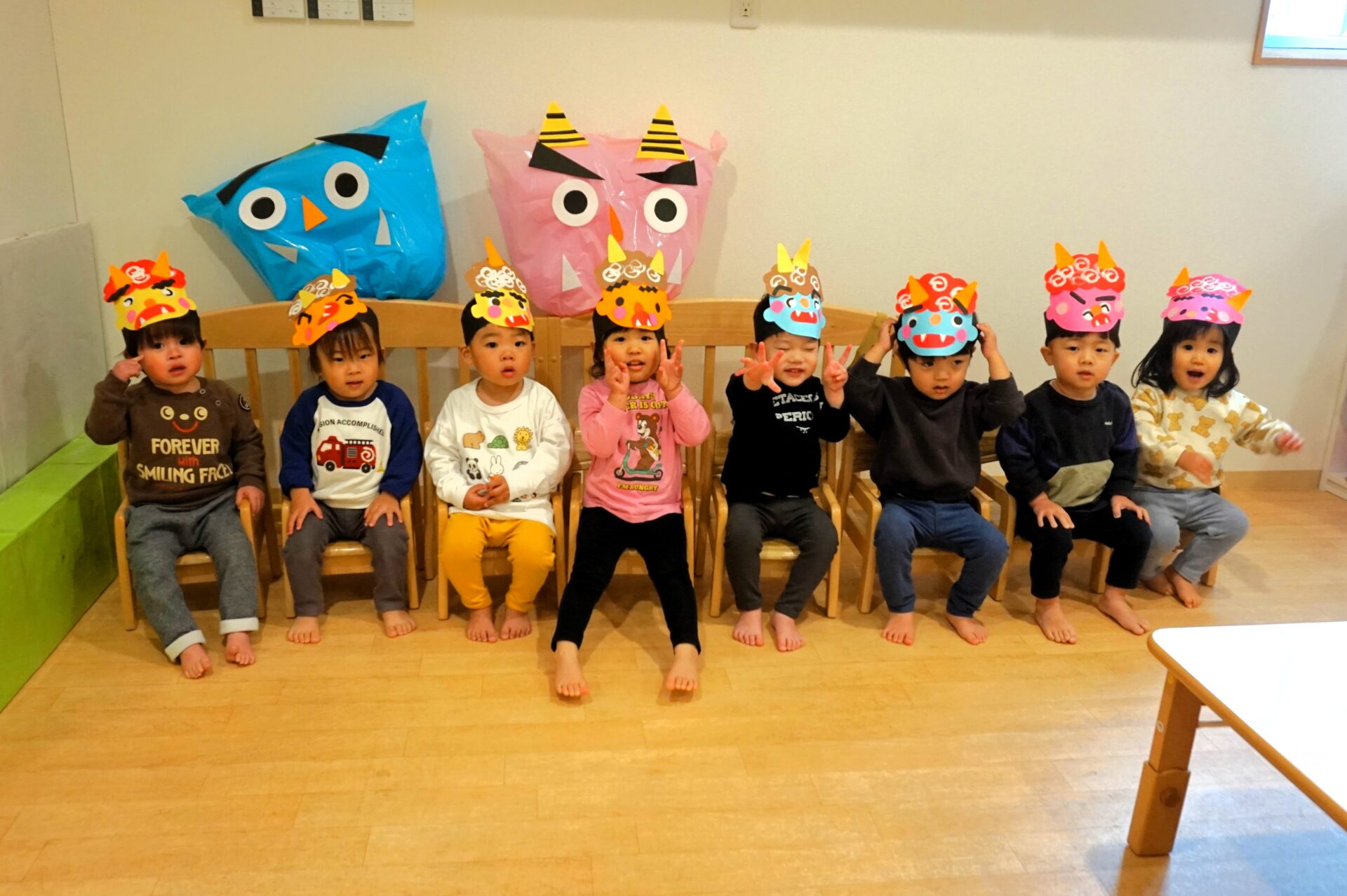 鬼をやっつけた後は、手作りの鬼の帽子を被って記念撮影✨